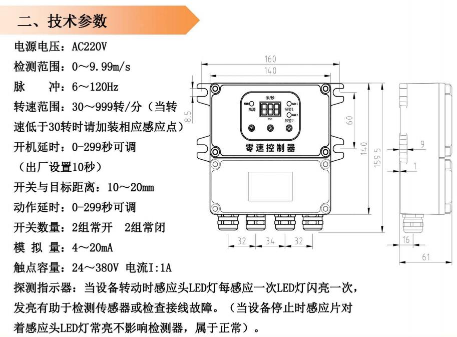概述  該檢測(cè)器是一種經(jīng)濟(jì)、可靠性強(qiáng)、對(duì)軸轉(zhuǎn)速及其他旋轉(zhuǎn)裝置簡(jiǎn)單通用的檢測(cè)裝置,當(dāng)檢測(cè)到目前信號(hào)低于或高于正常轉(zhuǎn)速范圍,開關(guān)輸出兩組開關(guān)信號(hào),以供報(bào)警或停機(jī)。無運(yùn)動(dòng)部件、無磨損、安全壽命長(zhǎng),一體化結(jié)構(gòu),集中的控制裝置,設(shè)定或故障檢修簡(jiǎn)單。外殼采用防水、防塵的殼體,可直接安裝在惡劣環(huán)境中使用。